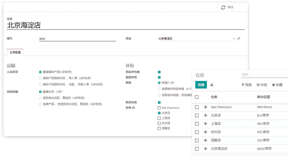 通过EDOS系统,轻松管理复杂的多公司仓库,一键设置仓库的运输出入库、补给方式 。