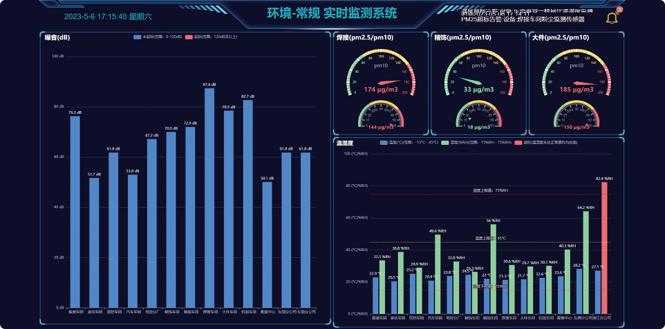 在工厂厂区、车间安装环境监测传感器,自动采集环境数据并连接厂区无线网络,传感器实时将环境数据发送到物联网平台,物联平台负责接收、处理、分析、转发数据。通过环境-安全监测大屏,实时查看工厂厂区的环境状况。环境参数出现异常值,系统提示并且发出报警。